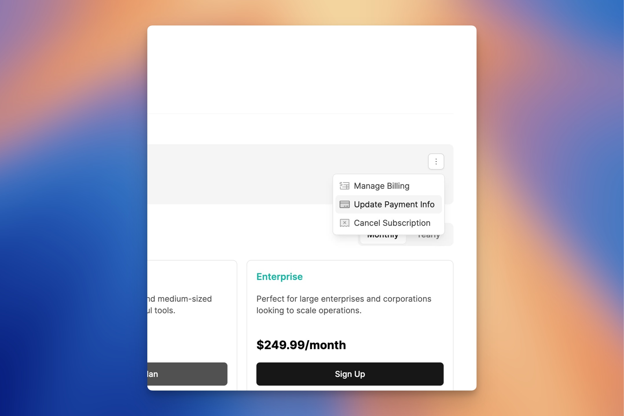 Users can create checkout links, manage their billing, cancel subscriptions, update payment methods etc.